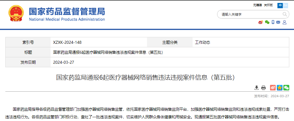 國家藥監(jiān)局通報6起醫(yī)療器械網(wǎng)絡銷售違法違規(guī)案件信息(第五批)